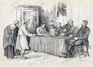15. Apsīšu Jēkabs „Pie pagasta tiesas”, 1909. Ilustrācija, mākslinieks E. Brencēns