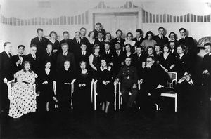 3. Rīgas mākslinieku grupas jubilejas izstāde. Priekšplānā sēž: Jānis Liepiņš, Oto Skulme, stāv: Niklāvs Strunke. 2. rinda no kreisās: Uga Skulme, Erasts Šveics, Konrāds Ubāns, Valdemārs Tone, Jānis Cielavs, Leo Svemps. 1930. Foto: R. Sutas un A. Beļcovas muzejs
