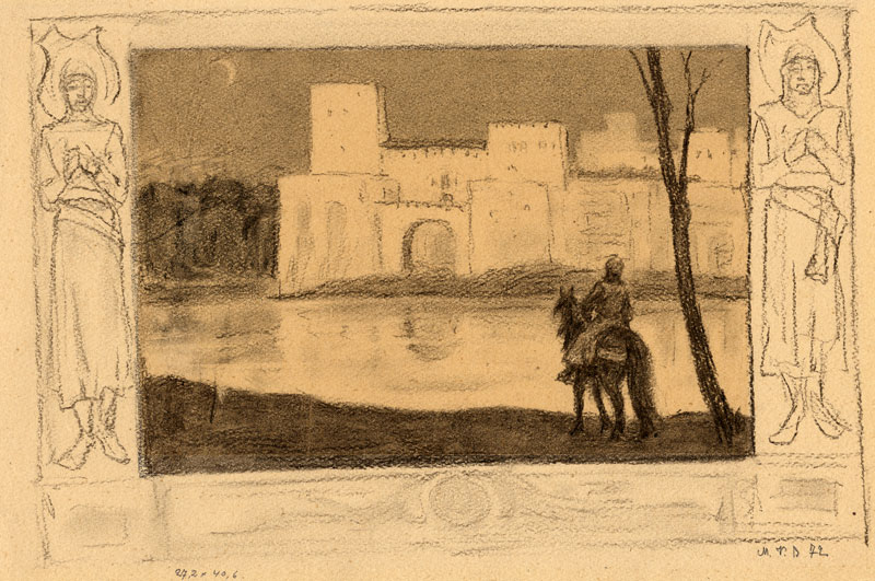 Ādams Alksnis. Jātnieks pils priekšā. 1890. gadu vidus. Papīrs, ogles zīmulis, 27,2 x 40,6 cm. LNMM