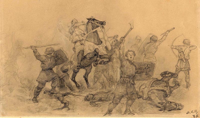 Ādams Alksnis. Senlatviešu kauja ar bruņiniekiem. Ap 1890. Papīrs, zīmulis, 17 x 27 cm. LNMM