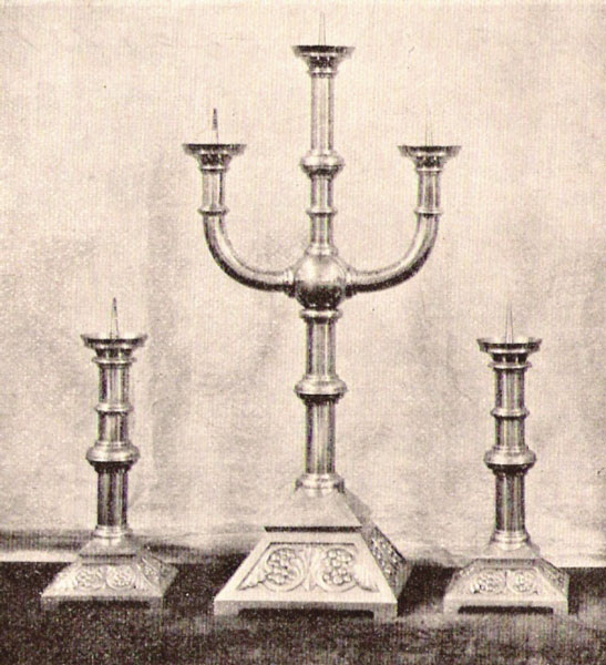 Rīgas Sv. Ģertrūdes Jaunās baznīcas svečturi. Alva, 20. gs. sākums. Rīga, meistars Radeckis. Attēls no: Jahrbuch für Bildenden Kunst in den Ostseeprovinzen. 1908.