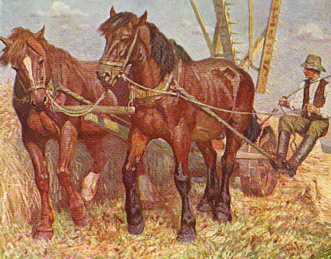 Ernsts Hermanis Gētgenss. Zirgi ar pļaujmašīnu. Ne vēlāk par 1913. Atrašanās vieta nezināma. No: Jahrbuch der bildenden Kunst in den Ostseeprovinzen. – 1913. – Jg. 7 (krās. ielīme).