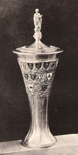 Rīgas Sv. Jāņa ģildes cunftu ģerboņu kauss. Zeltkalis R. Millers, A. Folca modelēta figūra. Sudrabs, emalja, 1906. Attēls no: Jahrbuch für Bildenden Kunstin den Ostseeprovinzen. 1908.