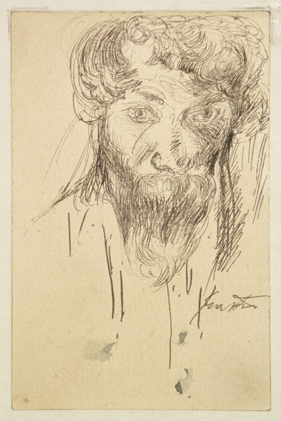 Pēteris Krastiņš. Pašportrets. Ap 1905–1910. Pastkarte, tuša, spalva. 14 x 19,1 cm. LNMM, inv. Nr. Z–3823.