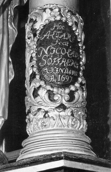 Sefrensa iegrieztais paraksts uz Liepājas Sv. Annas baznīcas retabla malējās kolonnas. Foto: M. Brašmane