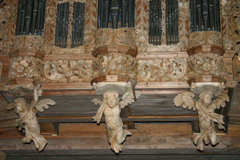 Ugāles baznīcas ērģeļes. Prospektu nesošie eņģeļi. Foto: E. Grosmane