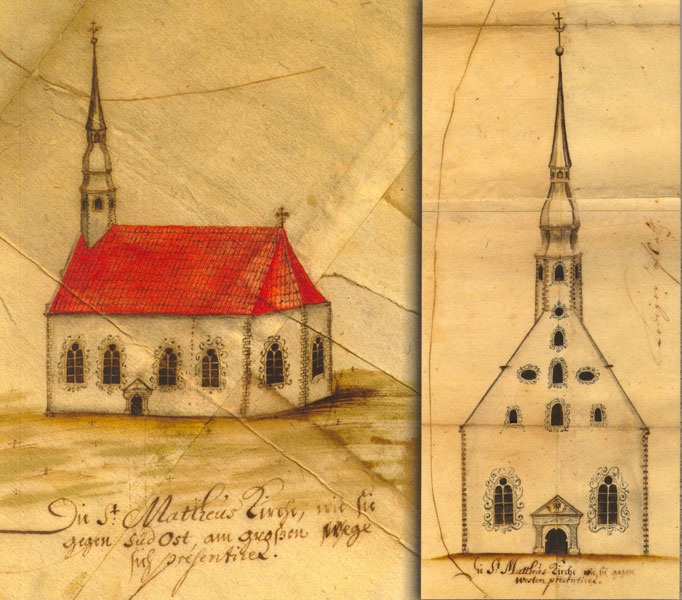 Matīšu baznīcas uzmērījuma zīmējums. Johans Abrams Ulrihs (Ulrich), 1692. LVVA, 7404. f., 1. apr., 2259. lieta