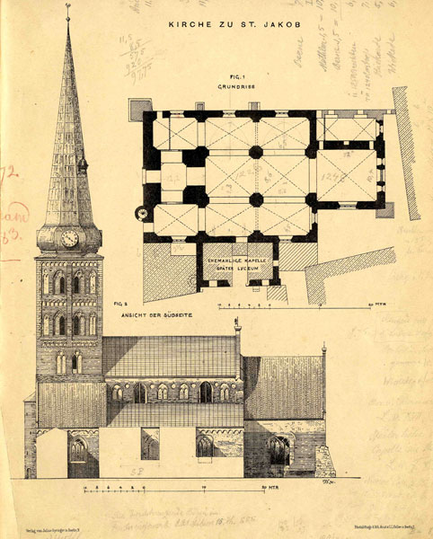 Vilhelms Neimanis Sv. Jēkaba baznīca plāns un dienvidu fasāde. No: Neumann, W. Das mittelalterliche Riga. Riga, 1892