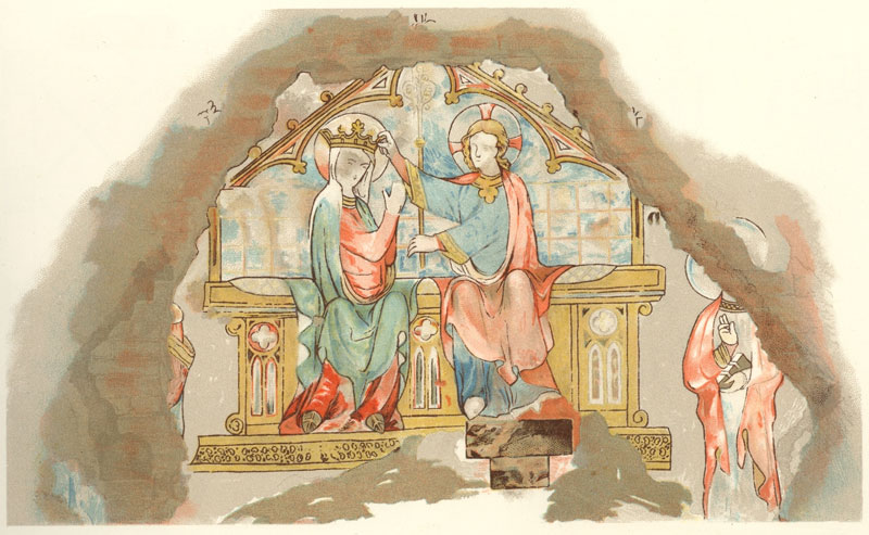 V. fon Štrika zīmējums. Viduslaiku gleznojums virs Rīgas Doma ziemeļu portāla “Marijas kronēšana debesīs”, 14. gs. sāk. No: Mohrmann, K. Die einstige Vorhalle am Dom zu Riga und deren Wandgemälde. Siebenter Rechenschaftsbericht der Abteilung der Gesellschaft für Geschichte und Altertumskunde für das Jahr 1891. Riga, 1892.
