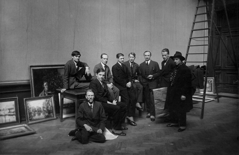 Rīgas mākslinieku grupas jubilejas izstāde. Priekšplānā sēž: Jānis Liepiņš, Oto Skulme, stāv: Niklāvs Strunke. 2. rinda no kreisās: Uga Skulme, Erasts Šveics, Konrāds Ubāns, Valdemārs Tone, Jānis Cielavs, Leo Svemps. 1930. Foto: R. Sutas un A. Beļcovas muzejs