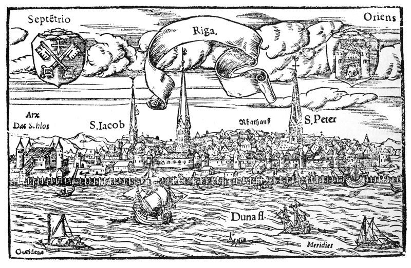 Senākā Rīgas panorāma no Sebastiana Minstera “Kosmogrāfija jeb visu zemju apraksts”, kas izdota Bāzelē 1550. g.