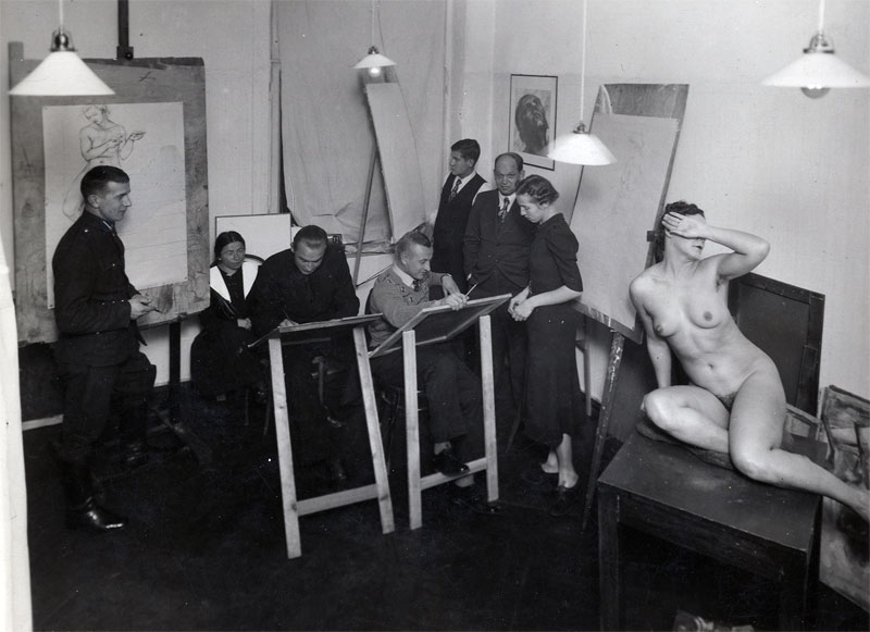 Romana Sutas privātstudija Rīgā, Vaļņu ielā. Otrais no labās – Romans Suta. 1937. – 1938. gads. Foto: Ed. Krauss, R. Sutas un A. Beļcovas muzejs