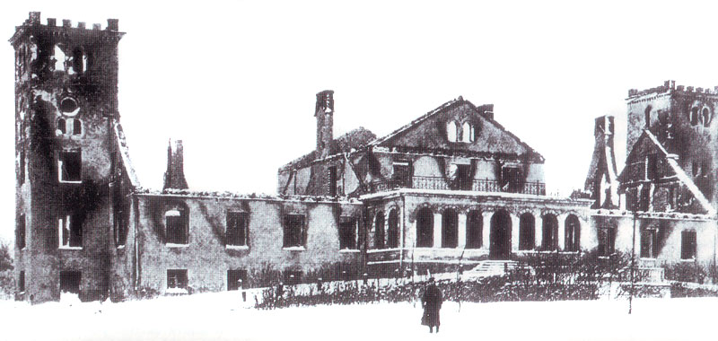 Suntažu muiža pēc nodedzināšanas 1905. g. revolūcijas laikā. 1906. g. Fotoreprodukcija: Illustrierte Beilage der Rigaschen Rundschau. 1906. Nr. 4. S. 32.