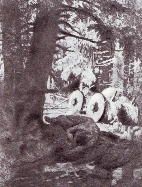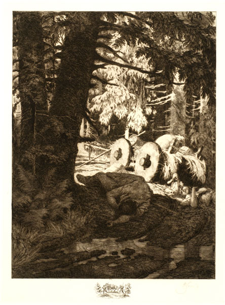 Rihards Zariņš. Nemierīgi laiki. No: Ko Latvijas meži šalc. 1908 – 1911. Papīrs, oforts, 61 x 45,5. LNMM