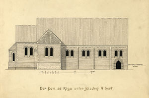 Šeit paredzēja izveidot lielāko kristīgās ticības izplatības centru Baltijas jūras austrumu piekrastē. Jau tolaik bija ieplānota grandiozas katedrāles un klostera celtniecība. Par paraugu noderēja Ziemeļvācijas tālaika arhitektūras lielākie sasniegumi - Lībekas, Raceburgas un Zēgebergas Doms, kuru pirmsākumi meklējami Heinriha Lauvas Braunšveigas Doma paradigmā, tādēļ Rīgas Doma pamati likti pēc sakšu pīlāru bazilikas parauga. Bija nepieciešams uzcelt trīsjomu baznīcu ar kubveida kori, šķērsjomu, trim apsīdām austrumos un diviem torņiem rietumos. Baznīcas altāra daļas mūrēšanu uzsāka ar kaļķakmens kvadriem, kas šķērsjomā sasniedza baznīcas logu augstumu.